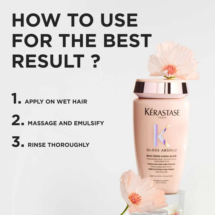 Gloss Absolu Bain Crème Hydra-Glaze er en kremete hydra-illuminating shampoo til tykt, krusete hår som etterlater håret intenst fuktet og glansfullt. Den kremete formelen inneholder hyaluronsyre, glykolsyre og villroseolje som renser hodebunnen dypt, glatter ut håret og gjør det enkelt å gre. Nyt fuktet, bouncy og glansfullt hår med 4 dagers anti-frizz.