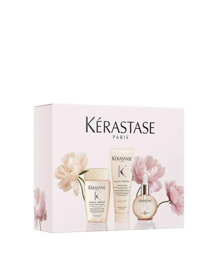 Settet inneholder følgende tre produkter: Gloss Absolu Bain Hydra-Glaze 80 ml, Gloss Absolu Insta Glaze Conditioner 75 ml, og Gloss Absolu Glaze Drops Hair Oil 45 ml.